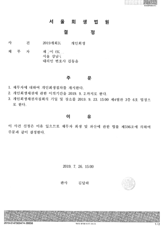 서울회생법원 (2019개회) 개시결정문 페이지 정보 작성자 김동윤 변호사 작성일19-08-01 15:44 조회7,061회 댓글0건 관련링크 이전글 다음글 목록 본문 서울회생법원 (2019개회) 개시결정문 댓글목록 등록된 댓글이 없습니다. 이전글 다음글 목록