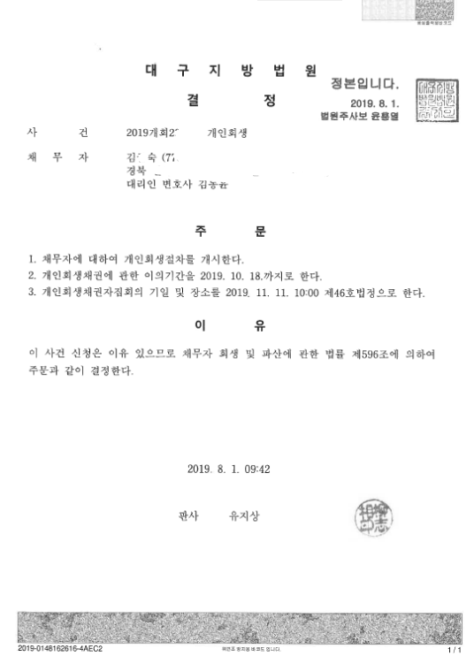 대구지방법원 (2019개회) 개시결정문 페이지 정보 작성자 김동윤 변호사 작성일19-08-05 15:54 조회7,088회 댓글0건 관련링크 이전글 다음글 목록 본문 대구지방법원 (2019개회) 개시결정문 댓글목록 등록된 댓글이 없습니다. 이전글 다음글 목록