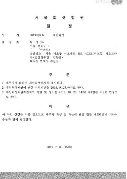 서울회생법원 (2019개회) 개시결정문 페이지 정보 작성자 김동윤 변호사 작성일19-08-05 15:56 조회6,925회 댓글0건 관련링크 이전글 다음글 목록 본문 서울회생법원 (2019개회) 개시결정문 댓글목록 등록된 댓글이 없습니다. 이전글 다음글 목록