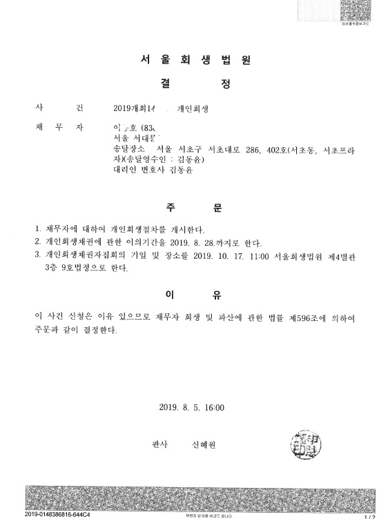서울회생법원 (2019개회) 개시결정문 페이지 정보 작성자 김동윤 변호사 작성일19-08-08 15:31 조회7,081회 댓글0건 관련링크 이전글 다음글 목록 본문 서울회생법원 (2019개회) 개시결정문 댓글목록 등록된 댓글이 없습니다. 이전글 다음글 목록