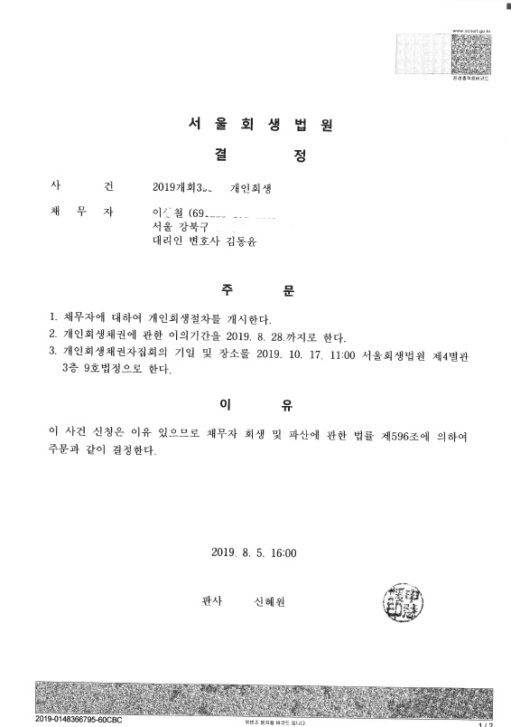 서울회생법원 (2019개회) 개시결정문 페이지 정보 작성자 김동윤 변호사 작성일19-08-08 15:32 조회6,995회 댓글0건 관련링크 이전글 다음글 목록 본문 서울회생법원 (2019개회) 개시결정문 댓글목록 등록된 댓글이 없습니다. 이전글 다음글 목록