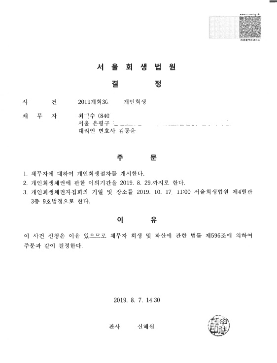 서울회생법원 (2019개회) 개시결정문 페이지 정보 작성자 김동윤 변호사 작성일19-08-12 14:15 조회7,158회 댓글0건 관련링크 이전글 다음글 목록 본문 서울회생법원 (2019개회) 개시결정문 댓글목록 등록된 댓글이 없습니다. 이전글 다음글 목록