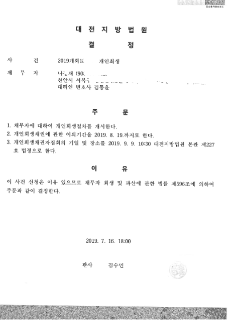 대전지방법원 (2019개회) 개시결정문 페이지 정보 작성자 김동윤 변호사 작성일19-07-19 14:29 조회7,077회 댓글0건 관련링크 이전글 다음글 목록 본문 대전지방법원 (2019개회) 개시결정문 댓글목록 등록된 댓글이 없습니다. 이전글 다음글 목록