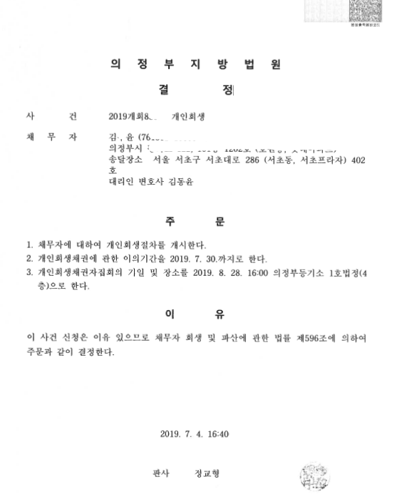 의정부지방법원 (2019개회) 개시결정문 페이지 정보 작성자 김동윤 변호사 작성일19-07-09 14:17 조회7,164회 댓글0건 관련링크 이전글 다음글 목록 본문 의정부지방법원 (2019개회) 개시결정문 댓글목록 등록된 댓글이 없습니다. 이전글 다음글 목록