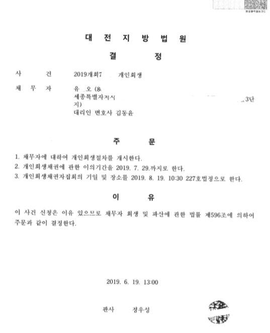 대전지방법원 (2019개회) 개시결정문 페이지 정보 작성자 김동윤 변호사 작성일19-06-24 14:31 조회6,986회 댓글0건 관련링크 이전글 다음글 목록 본문 대전지방법원 (2019개회) 개시결정문 댓글목록 등록된 댓글이 없습니다. 이전글 다음글 목록