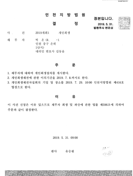 인천지방법원 (2019개회) 개시결정문 페이지 정보 작성자 김동윤 변호사 작성일19-06-05 14:37 조회7,250회 댓글0건 관련링크 이전글 다음글 목록 본문 인천지방법원 (2019개회) 개시결정문 댓글목록 등록된 댓글이 없습니다. 이전글 다음글 목록