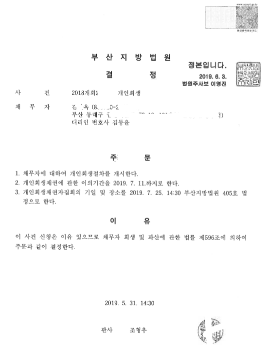 부산지방법원 (2018개회) 개시결정문 페이지 정보 작성자 김동윤 변호사 작성일19-06-10 09:19 조회6,748회 댓글0건 관련링크 이전글 다음글 목록 본문 부산지방법원 (2018개회) 개시결정문 댓글목록 등록된 댓글이 없습니다. 이전글 다음글 목록