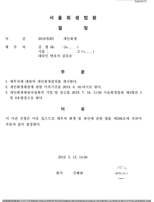서울회생법원 (2019개회) 개시결정문 페이지 정보 작성자 김동윤 변호사 작성일19-05-16 14:34 조회6,912회 댓글0건 관련링크 이전글 다음글 목록 본문 서울회생법원 (2019개회) 개시결정문 댓글목록 등록된 댓글이 없습니다. 이전글 다음글 목록