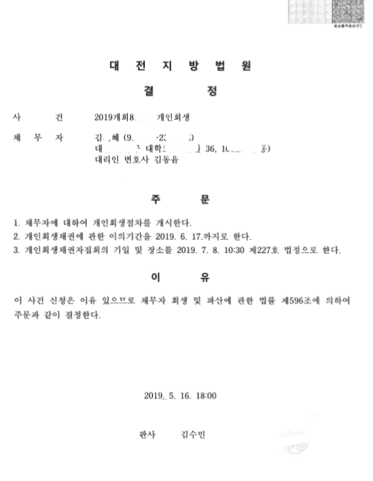 대전지방법원 (2019개회) 개시결정문 페이지 정보 작성자 김동윤 변호사 작성일19-05-22 10:52 조회6,733회 댓글0건 관련링크 이전글 다음글 목록 본문 대전지방법원 (2019개회) 개시결정문 댓글목록 등록된 댓글이 없습니다. 이전글 다음글 목록