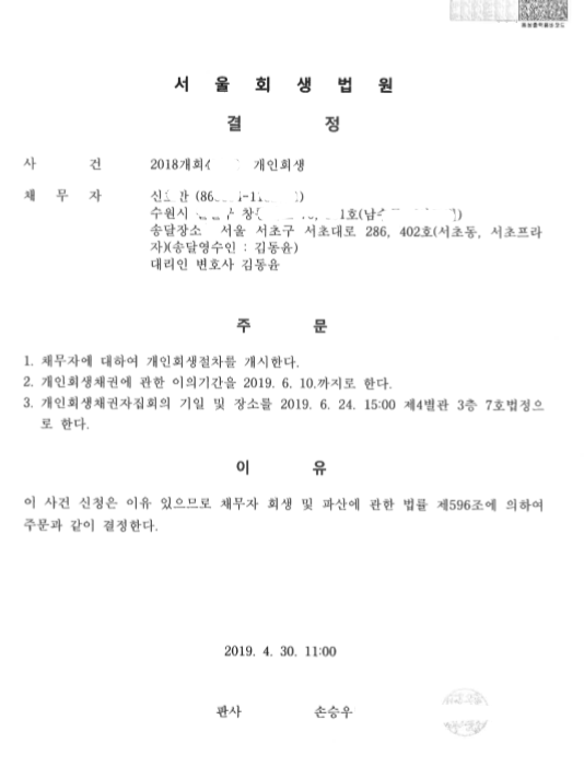 서울회생법원 (2018개회) 개시결정문 페이지 정보 작성자 김동윤 변호사 작성일19-05-08 14:22 조회6,627회 댓글0건 관련링크 이전글 다음글 목록 본문 서울회생법원 (2018개회) 개시결정문 댓글목록 등록된 댓글이 없습니다. 이전글 다음글 목록