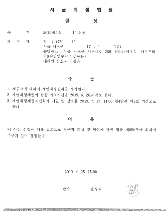 서울회생법원 (2019개회) 개시결정문 페이지 정보 작성자 김동윤 변호사 작성일19-04-30 14:36 조회6,580회 댓글0건 관련링크 이전글 다음글 목록 본문 서울회생법원 (2019개회) 개시결정문 댓글목록 등록된 댓글이 없습니다. 이전글 다음글 목록