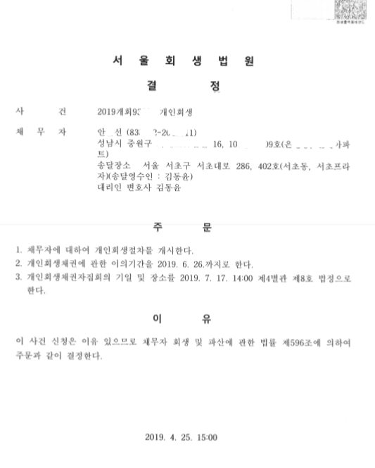 서울회생법원 (2019개회) 개시결정문 페이지 정보 작성자 김동윤 변호사 작성일19-04-30 14:38 조회6,362회 댓글0건 관련링크 이전글 다음글 목록 본문 서울회생법원 (2019개회) 개시결정문 댓글목록 등록된 댓글이 없습니다. 이전글 다음글 목록