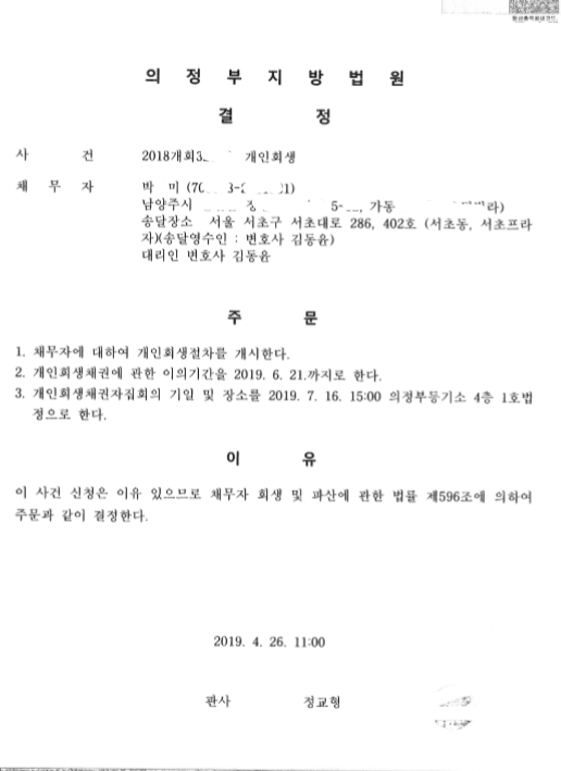 의정부지방법원 (2018개회) 개시결정문 페이지 정보 작성자 김동윤 변호사 작성일19-05-02 13:36 조회6,554회 댓글0건 관련링크 이전글 다음글 목록 본문 의정부지방법원 (2018개회) 개시결정문 댓글목록 등록된 댓글이 없습니다. 이전글 다음글 목록