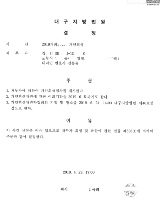 대구지방법원 (2019개회) 개시결정문 페이지 정보 작성자 김동윤 변호사 작성일19-04-26 14:25 조회6,014회 댓글0건 관련링크 이전글 다음글 목록 본문 대구지방법원 (2019개회) 개시결정문 댓글목록 등록된 댓글이 없습니다. 이전글 다음글 목록