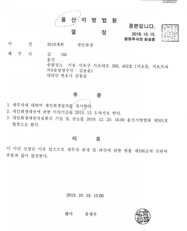 [ 42% 탕감 / 급여 압류 중지 ] 개시결정 (울산)