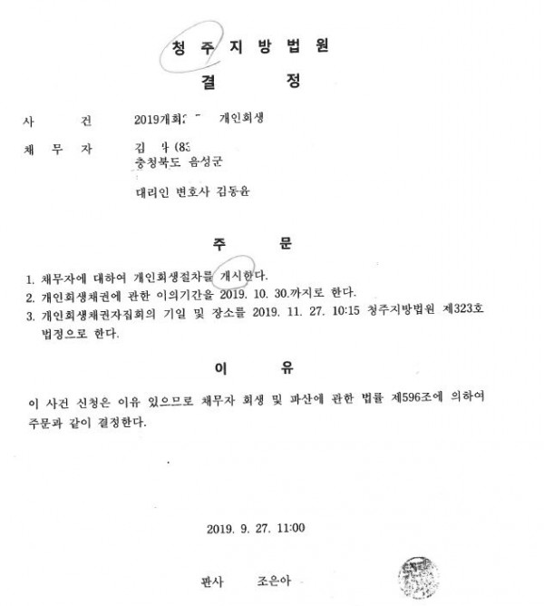 [ 연대보증채무 / 46% 탕감 ] 개시결정 (청주)