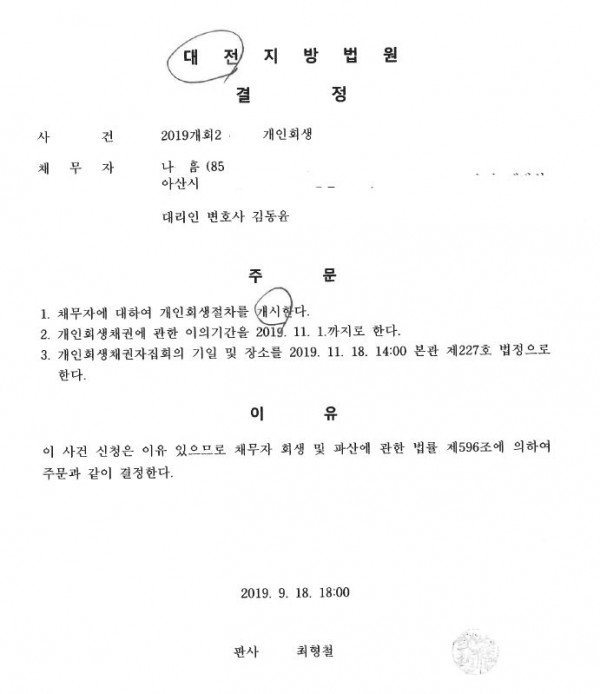 [ 채무 1.2억 ] 개시결정 (대전) 페이지 정보 작성자 김동윤 변호사 작성일19-09-24 17:49 조회6,980회 댓글0건 관련링크 이전글 다음글 목록 본문 [ 특이사항 ]- 채무 1억 2000만원- 급여 353만원- 월 변제금 215만원 × 36개월 = 총 7740만원 변제 (변제율 : 원금 80%) 댓글목록 등록된 댓글이 없습니다. 이전글 다음글 목록